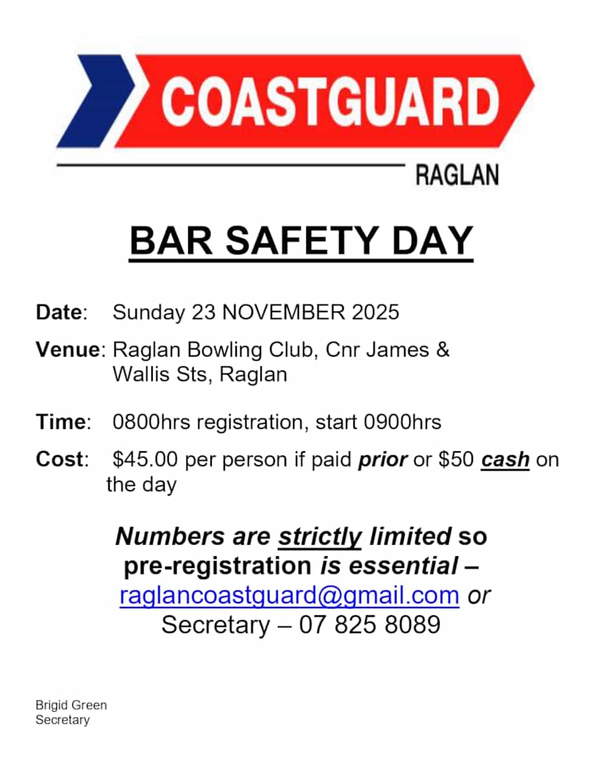 Note: The Raglan Bar Safety Day includes a trip out on the Coastguard vessel Gallagher Rescue (subject to weather). There is a cost to this and the local crew request that you please email raglancoastguard@gmail.com to secure your spot on the vessel .  |