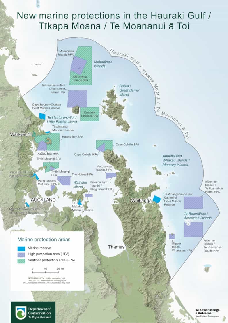 New Marine Protection Sites announced for New Zealand’s Hauraki Gulf The Hauraki Gulf/Tīkapa Moana Marine Protection Act came into force on 25 October 2025. The Hauraki Gulf/Tīkapa Moana Marine Protection Bill, recently accepted by the New Zealand Government, aims at protecting and restoring the marine environment of the gulf situated off Auckland on North Island. A network of 19 new marine protection sites within the gulf includes two new marine reserves and 12 “high protection areas” (HPAs) to protect and restore marine habitats and ecosystems. Read more details on the Hauraki Gulf/Tīkapa Moana Marine Protection here.  |
