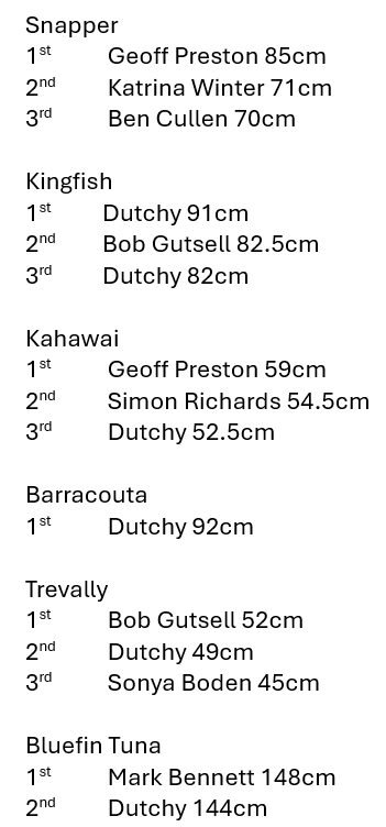 What a month! Our Winter Champs Prizegiving may have been small in numbers, but it was big on fun. A huge thanks to everyone who came along and helped make it a great night. Now… about the pizza. Apologies to those who turned up hungry and left even hungrier! We had a full order in with Domino’s, but after a wild runaround and no delivery, we’ve officially lodged a complaint. The silver lining? We might just have sparked a sponsorship opportunity out of it — so watch this space! Looking ahead, the Shelly Beach Competition is coming up fast — mark your calendars for November 8th! We’ve got a $4000 prize pool this year, so it’s shaping up to be a cracker. See the poster and full details later in this edition. In the meantime, give Coromandel Shelly Beach Top 10 Holiday Park a call to book your spot, then head to our website or the Sporty App to get your entry sorted. Note that the coast road to Coromandel is closed for Bridge repairs the next week or two and scheduled to be open for the weekend of our comp. We'll be watching this activity very closely and will let you know closer to the time if their plan has changed to the point of impacting our plans. We’re also proud to announce our new enhanced format SIMRAD Summer Champs! We’re sticking with the popular measurement-based entry for inshore species like Snapper, Kahawai, Trevally, Gurnard, and Kingfish. But new this year — we’re introducing weighed pelagic species including Billfish, Bigeye, Yellowfin, Bluefin, Albacore, and Skipjack Tuna, plus a new category for Wreckfish (Bass, Bluenose, and Hapuka). Full details are in the article later in this edition, and we’ll be talking more about it at our November Club Night. And finally — put a ring around December 10th! We’re finishing the year with a bang at another Coastguard-supported Club Night, where we’ll dive into bar crossing safety and summer game fishing tips. Our good mate Ben Brown — Mr Built to Fish himself — will be back to share how he landed 60 marlin off the west coast last season! We’ll also cover tackle rigging and do a quick review of tackle rules to get everyone summer-ready. As always, thanks for your support and enthusiasm. Tight lines and good vibes ahead! Cheers Bob  |