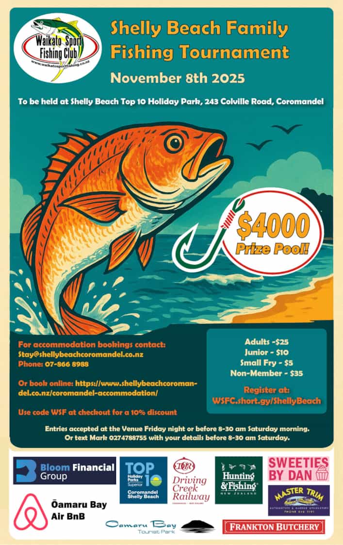 Shelly Beach 2025The much-loved annual WSFC Shelly Beach Family Fishing Tournament is returning this year and will be held on Saturday 8th November. Hosted by WSFC at the Shelly Beach Top 10 Holiday Park, the competition offers a wonderful opportunity for families and fishing enthusiasts to spend a weekend together in a friendly and welcoming environment. Once again we have our much loved spot prize of 2 nights’ accommodation in an Air BnB beach front property at Oamaru Bay valued at $1200 thanks to Shane Mellow at Stainless Solutions. This year's Driving Creek Railways spot prize is a voucher for four participants to attend a pottery class which promises plenty of fun, offering an enjoyable and creative activity that groups can share together. Prize Categories- Snapper