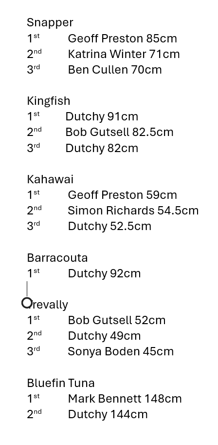 Prizes for 1st, 2nd and 3rd in five species and single prize for Barracoutta